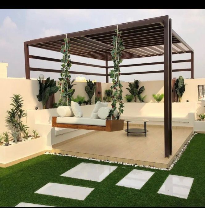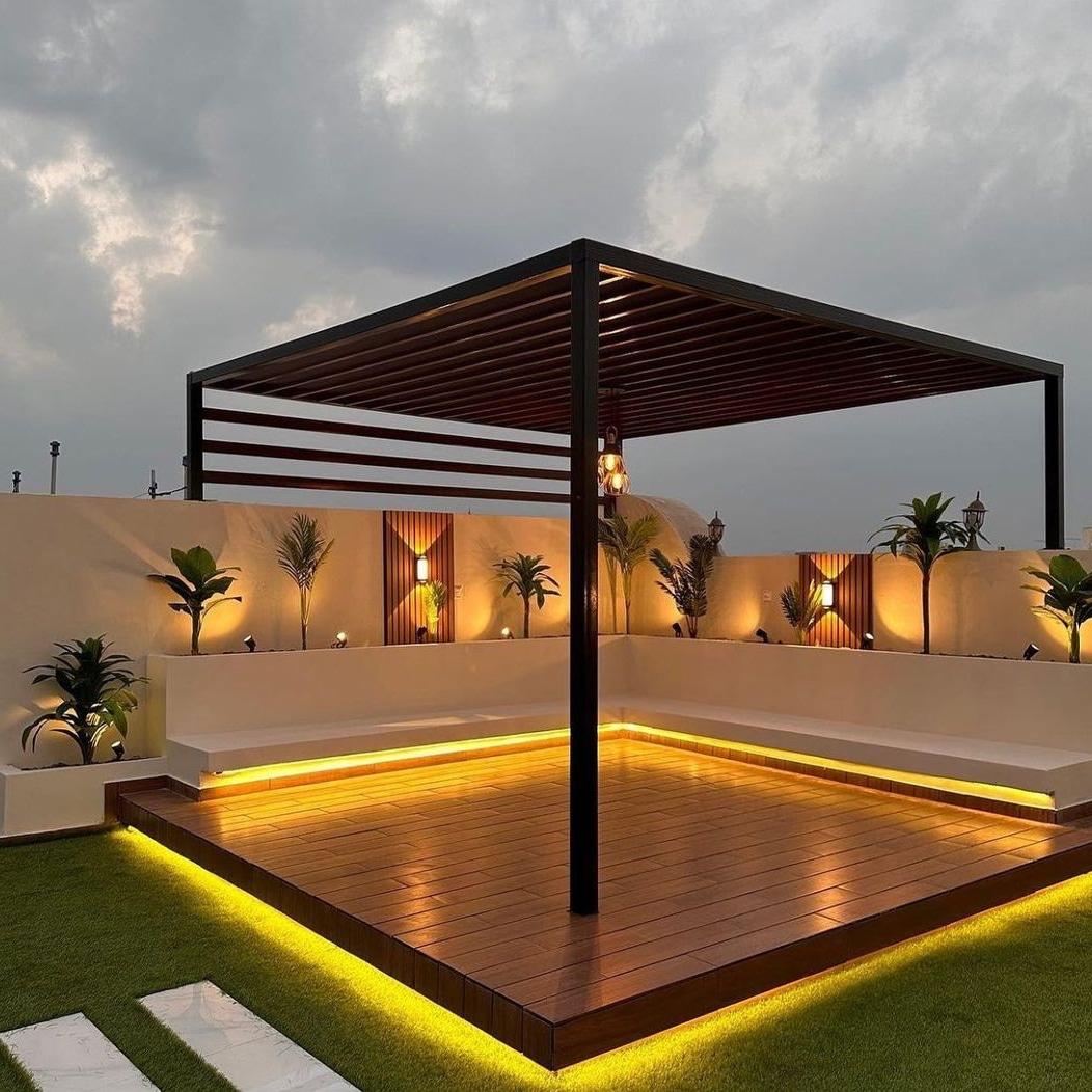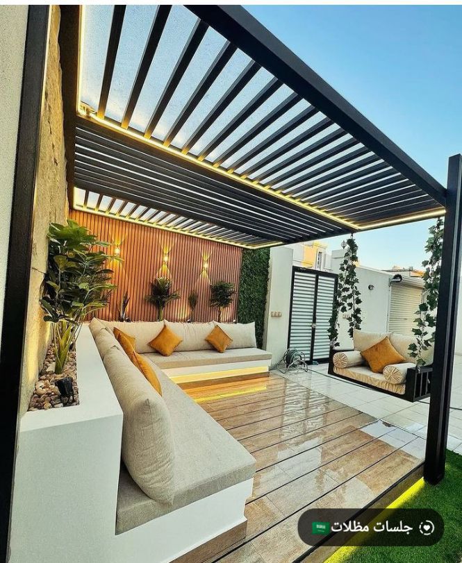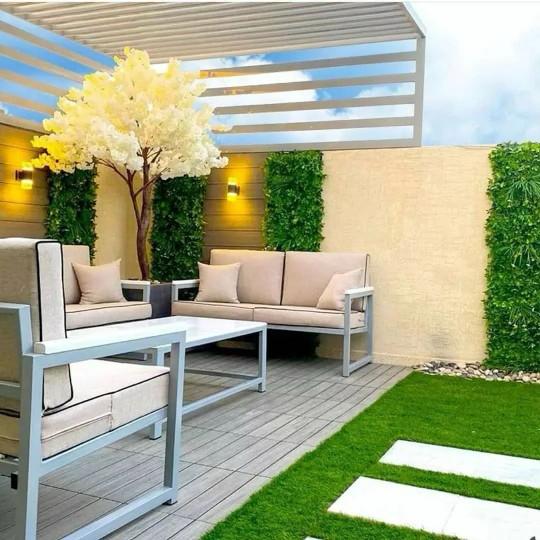 كما ان تصميم الجلسات الخارجية المودن علي الطريقة اليونانية فهي تعطي طابع راقي وجميل لسطح المنزل مع الزرع الصناعي والورود والاضاءة المخفية كما ان يمكنك التواصل مع مؤسسة راكان لتحصل علي افخم جلسة خارجية لسطح منزلك